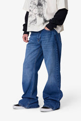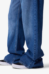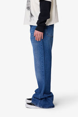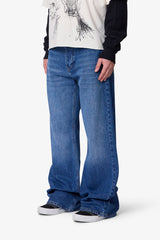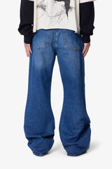 The Kick Flare Denim - Blue is constructed from 100% cotton denim with a medium blue wash. Designed with a relaxed bootcut fit, it features a roomy thigh and knee, and a super wide opening for an exaggerated flared silhouette. Distressed with subtle whiskering and sanding details for added texture. Finished with a button fly, standard 5-pocket construction, belt loops, and a clean hem.