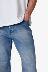 - Medium blue vintage wash with subtle whiskering