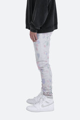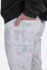 the M363 Painted Denim is part of our new M300 line of zipperless M Denim. The M363 Painted Denim features a relaxed fit through the thigh that tapers from the knee to the ankle, constructed from off white denim, pastel paint details throughout and finishes off with a traditional zipperless inseam.