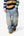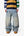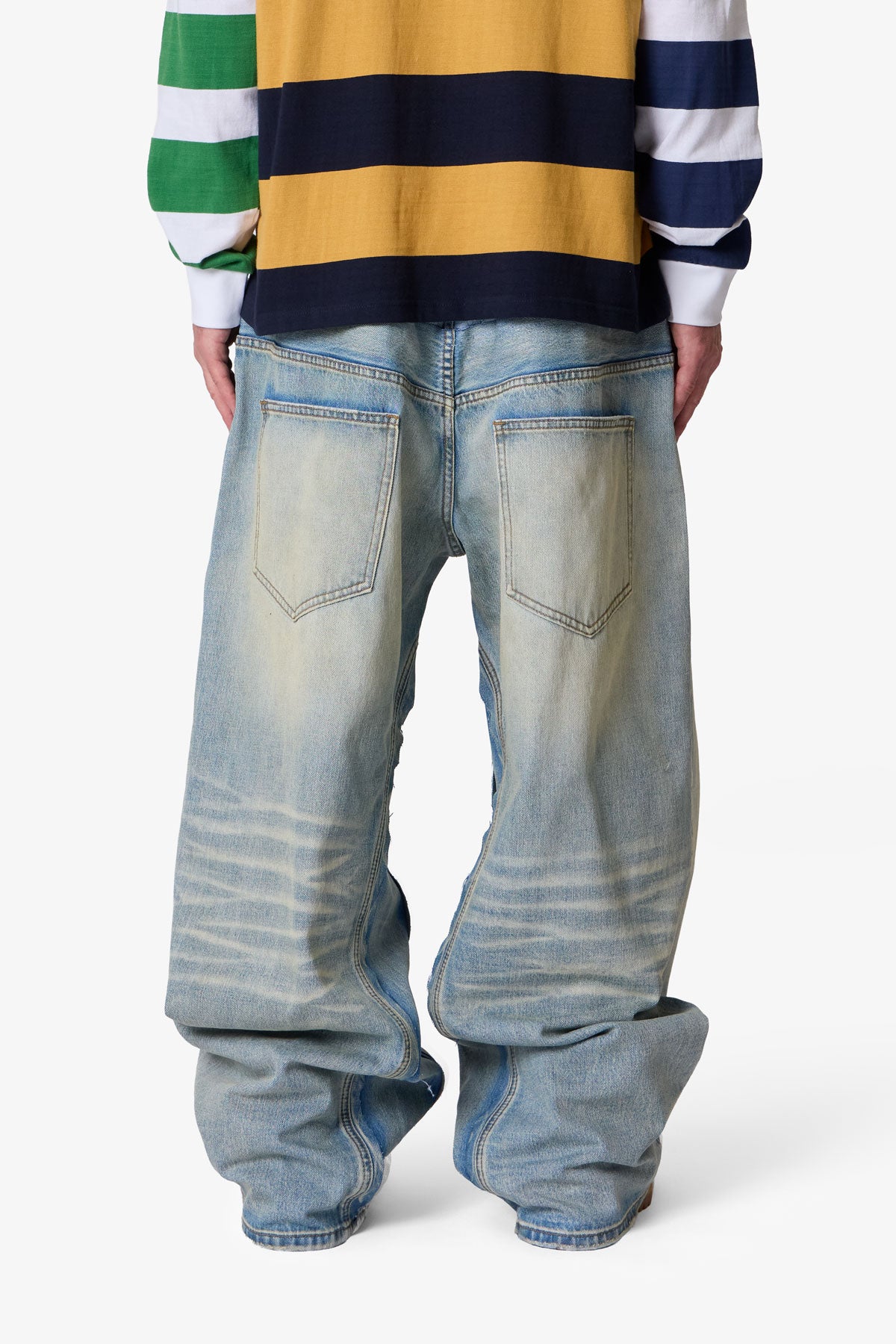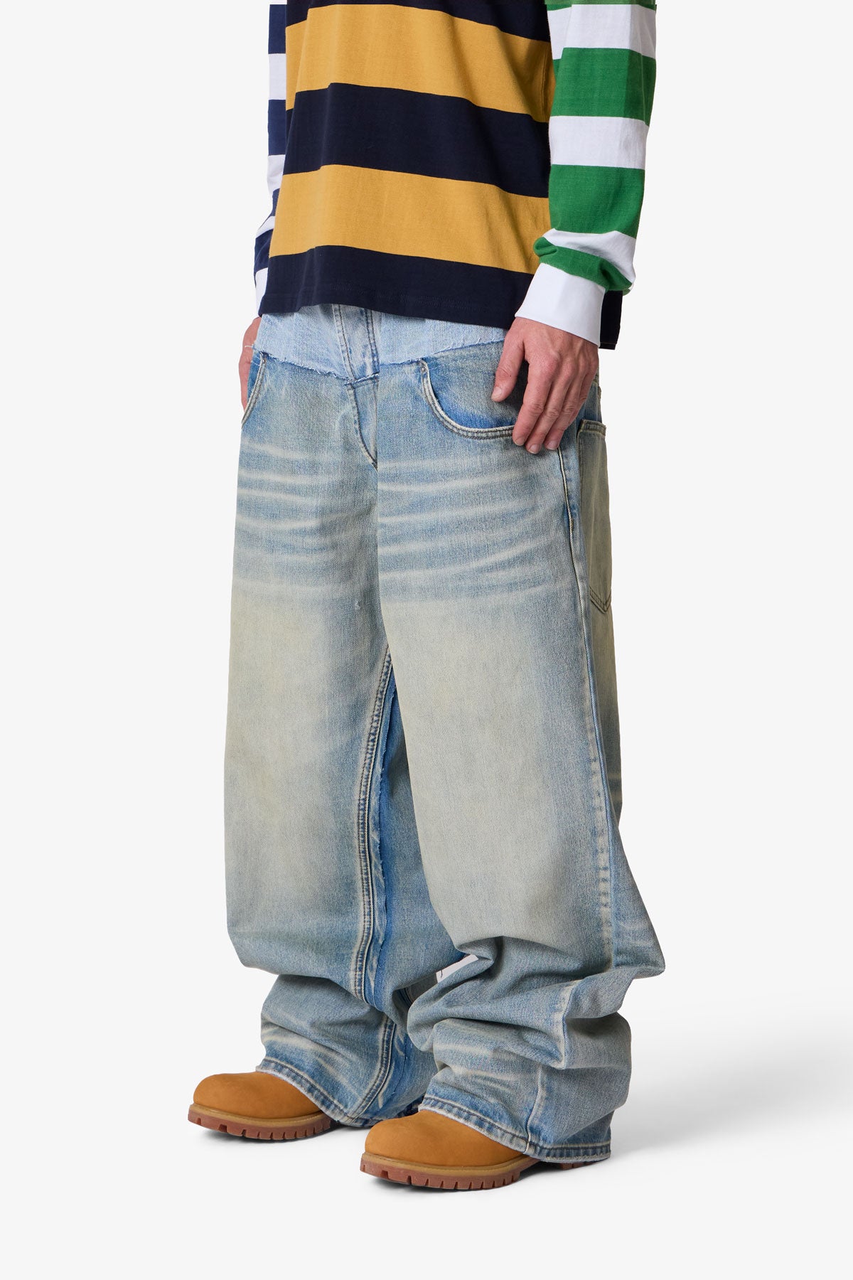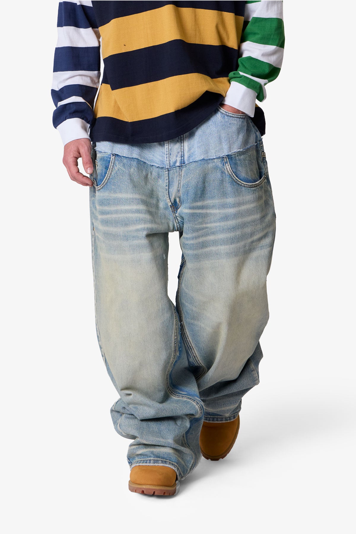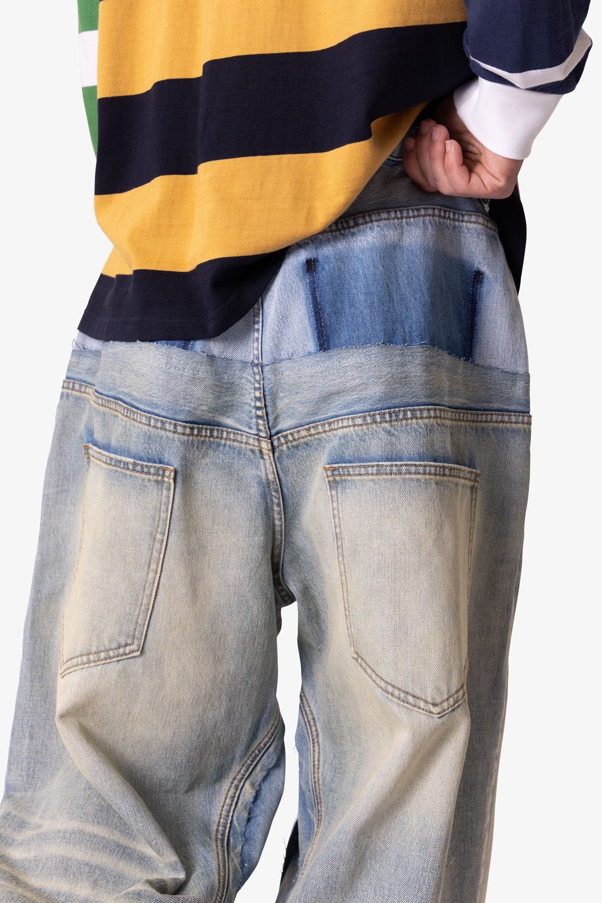 The Mega Baggy Layered Denim is designed with a mega baggy fit, featuring oversized legs and a unique faux double layer construction that provides the appearance of denim over denim. It includes an adjustable drawcorded waist with a decorative floral print internal drawcord, adding functionality to its vintage medium blue denim aesthetic. The garment highlights whiskering and sanding details, along with light distressing and back ghost pockets for a contemporary look.