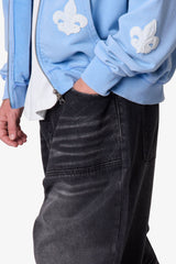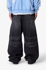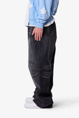 Constructed from 100% cotton denim, the Mega Baggy Moto Denim features a stone washed and wax-coated finish with sanding and whiskering details. Designed with a loose, oversized silhouette offered in four sizes, the pants include an adjustable waist with a floral print drawcord, knee gussets, and paneled construction. Finished with a classic five-pocket layout and button fly closure.