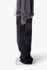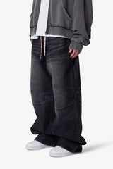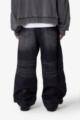 Constructed from 100% cotton denim, the Mega Baggy Moto Denim features a stone washed and wax-coated finish with sanding and whiskering details. Designed with a loose, oversized silhouette offered in four sizes, the pants include an adjustable waist with a floral print drawcord, knee gussets, and paneled construction. Finished with a classic five-pocket layout and button fly closure.