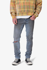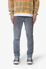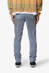 The Oil Ruched Skinny Denim features a skinny fit construction with a light vintage wash and pp spray for a worn-in appearance. Designed with engineered honeycomb ruching at the knees and thighs, it includes subtle distressing and a knee blowout. Constructed from stretch denim with functional 5-pocket styling and a zip fly.