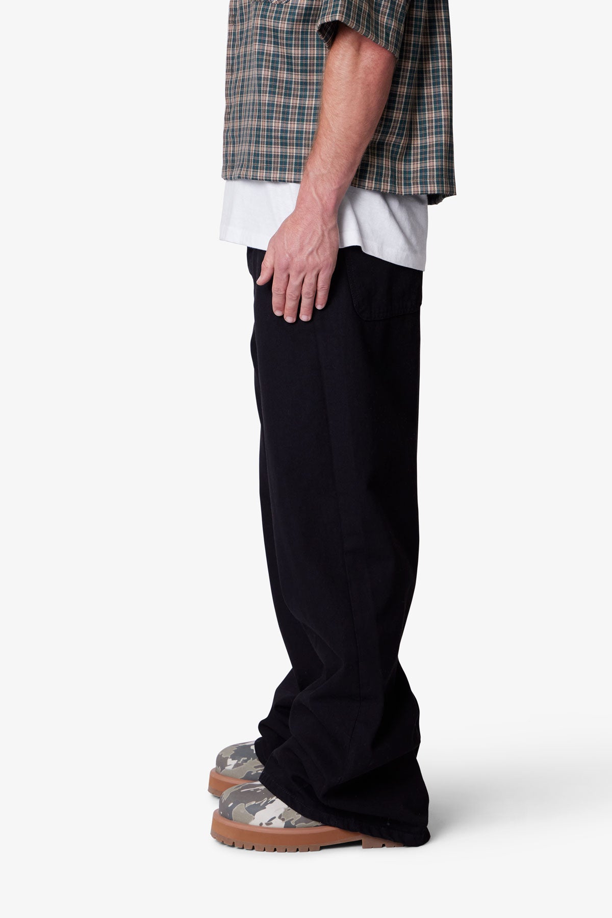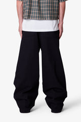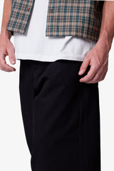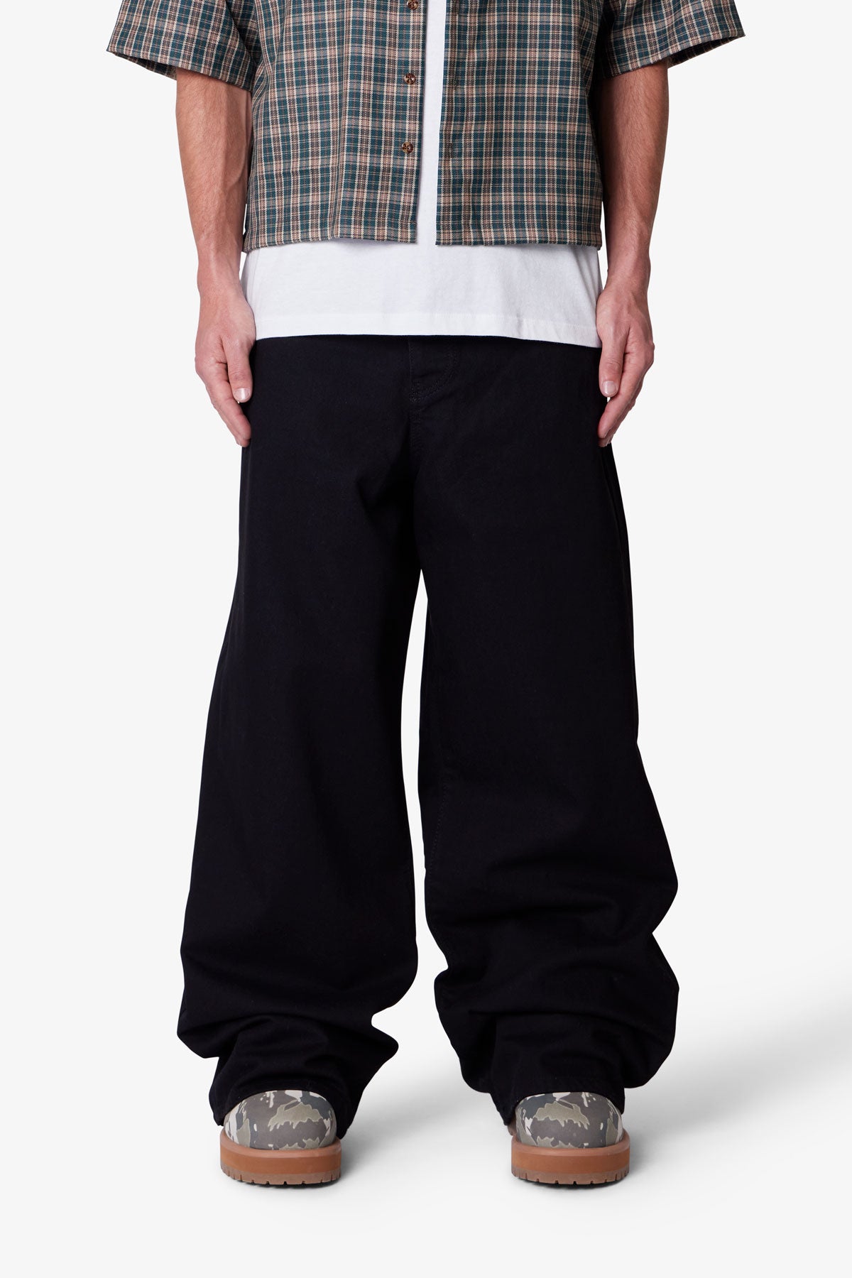 The Raw Baggy Rave Denim is made from 100% cotton and features a light wash for added softness and reduced indigo dye bleed. Designed in a rave baggy fit, this denim pant comes in a classic raw black shade with contrast gold stitching. Finished with a traditional five-pocket layout, metal front button, and button fly closure.