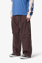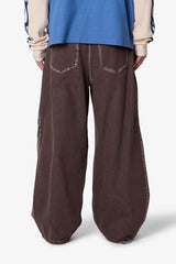 - Barrel silhouette with wide, baggy fit