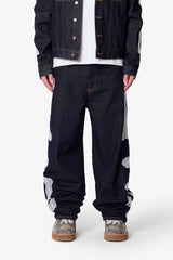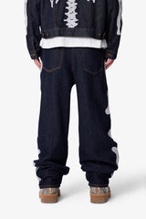 The Raw Skeleton Ultra Baggy Denim is constructed from 84% cotton and 16% polyester in a rinse-washed raw denim. Designed with an ultra baggy silhouette, it features chain stitch skeleton patch appliques and standard five-pocket construction. Finished with contrast gold stitching, button fly, and belt loops.