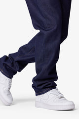 The Raw Straight Denim is constructed from 100% cotton in a classic straight-leg fit. Treated with a single rinse wash for minimal indigo bleed and a slightly softened texture, this denim features traditional gold contrast stitching and five-pocket construction. Finished with a front fly and metal button closure for a secure fit.