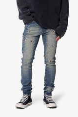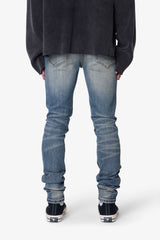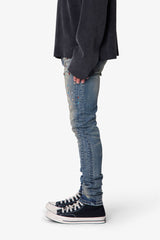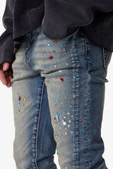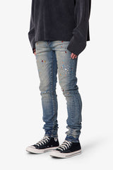 The Skinny Crystal Denim - Washed Blue is constructed from 98% cotton and 2% spandex with a medium blue wash. Designed in a skinny fit, this denim features whiskering, sanding, and a knee blowout. Additional design elements include front leg panel detailing and allover embellishments of charms, gems, and crystals. Finished with a standard five-pocket layout, belt loops, a zipper fly, and a released hem.