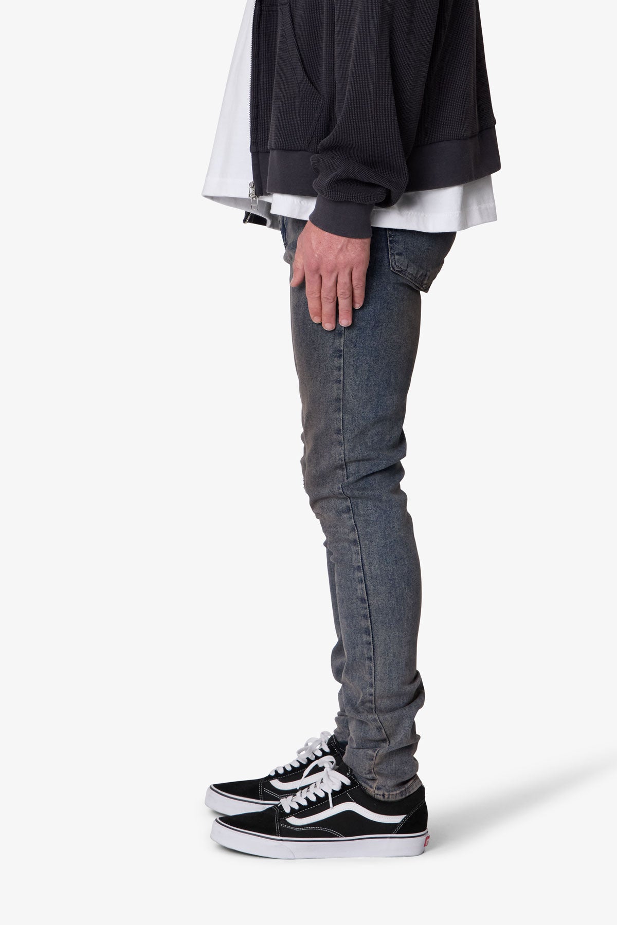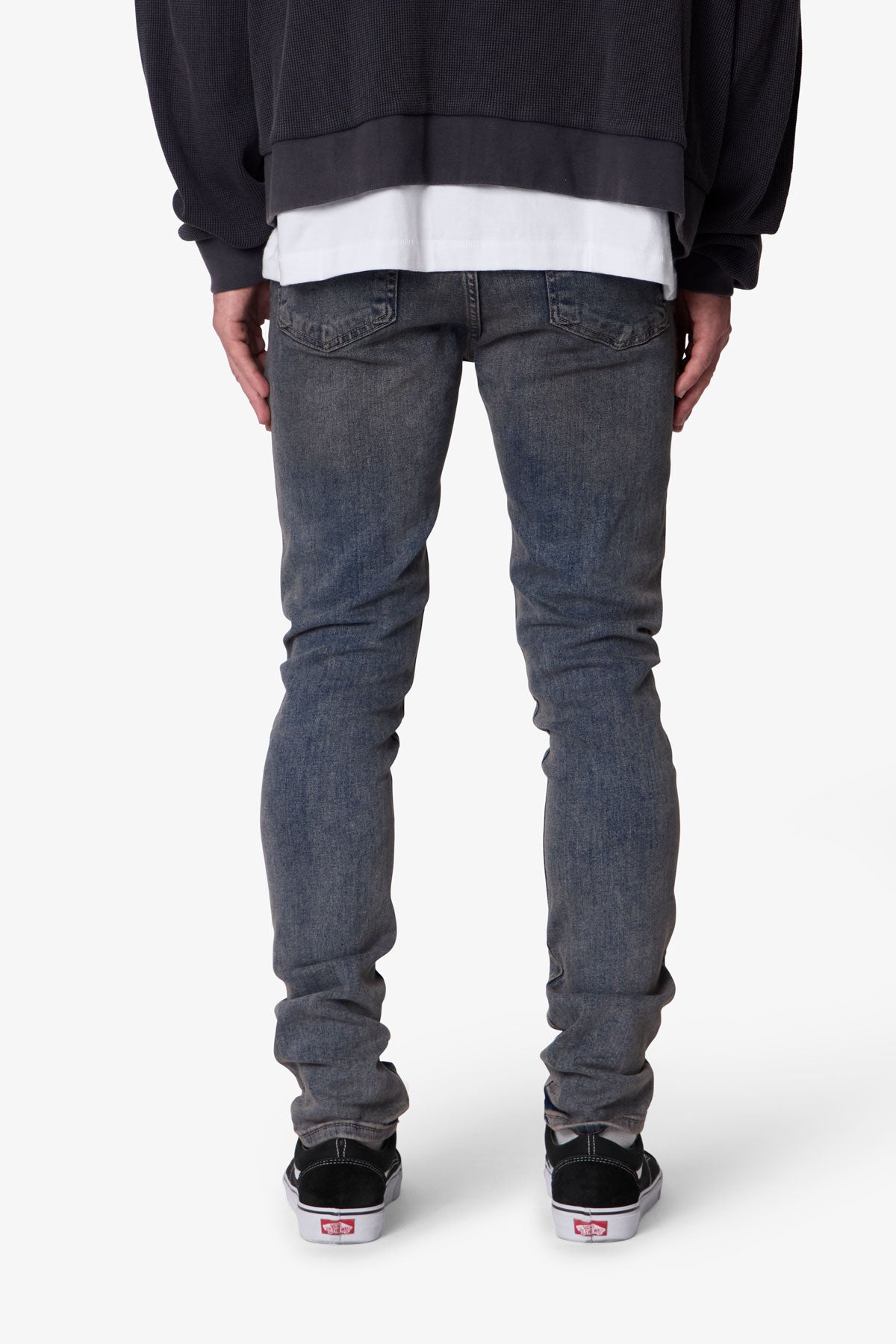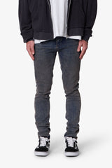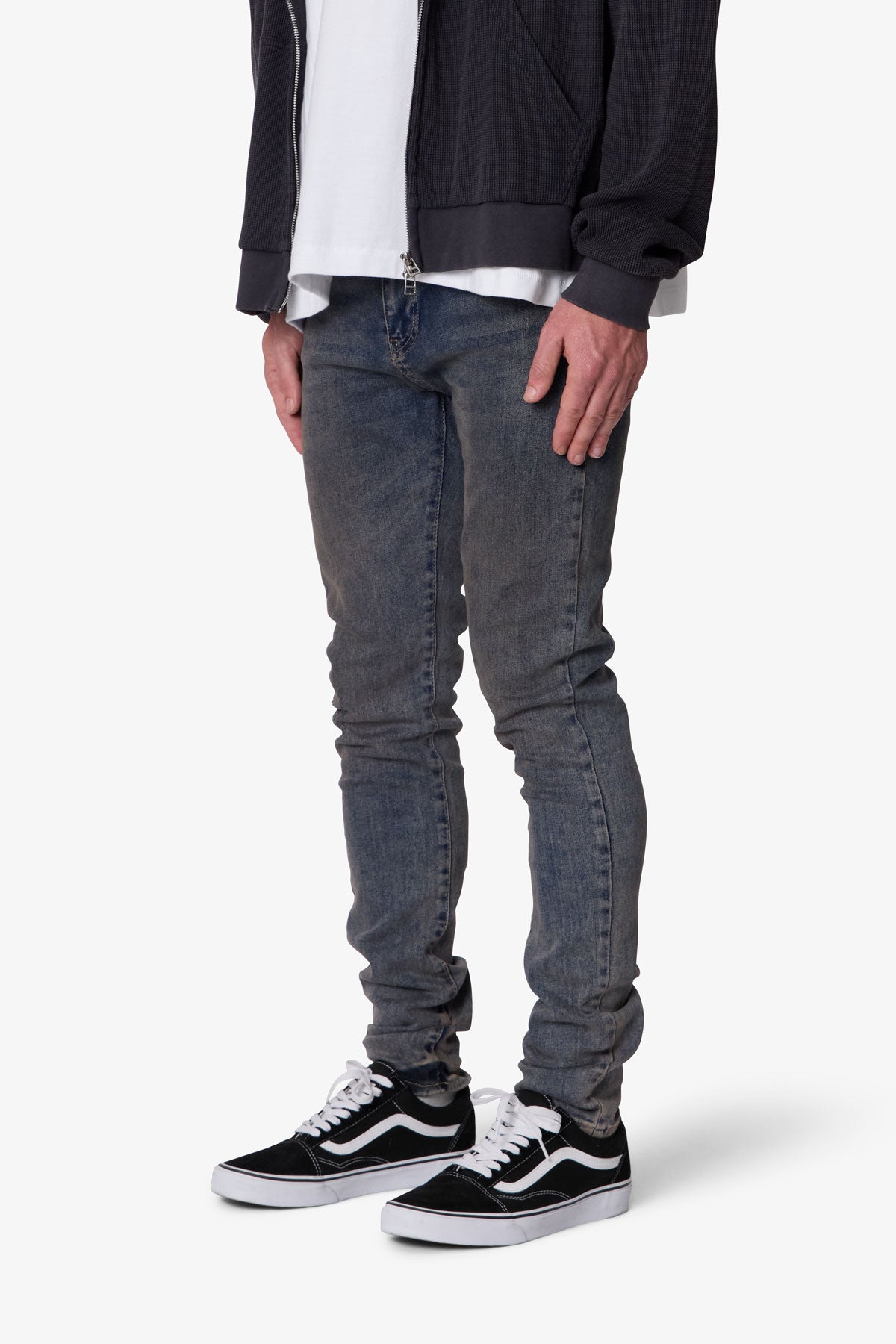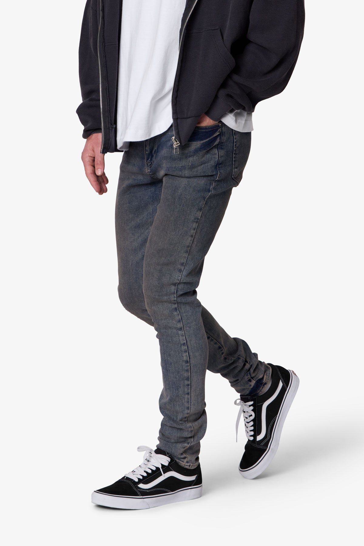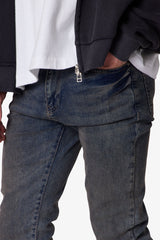 The Skinny Oil Denim - Medium Blue is constructed from a stretch-infused cotton blend and features a medium dark washed base with light whiskering and subtle distressing throughout. Designed with a skinny fit through the leg and stacked whiskering at the leg opening, it includes a standard waistband with a zipper fly, five-pocket layout, and belt loops.