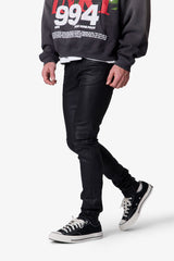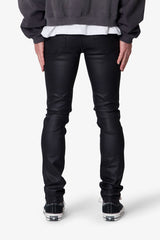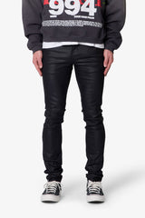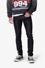 The Skinny Waxed Denim features a modern skinny fit design crafted from a blend of cotton and spandex, providing both comfort and flexibility. The denim is coated in a wax layer that offers a light sheen, enhancing its contemporary appeal. Constructed with an extended seam for stacking and standard 5-pocket styling, this piece combines functionality with sleek aesthetics.