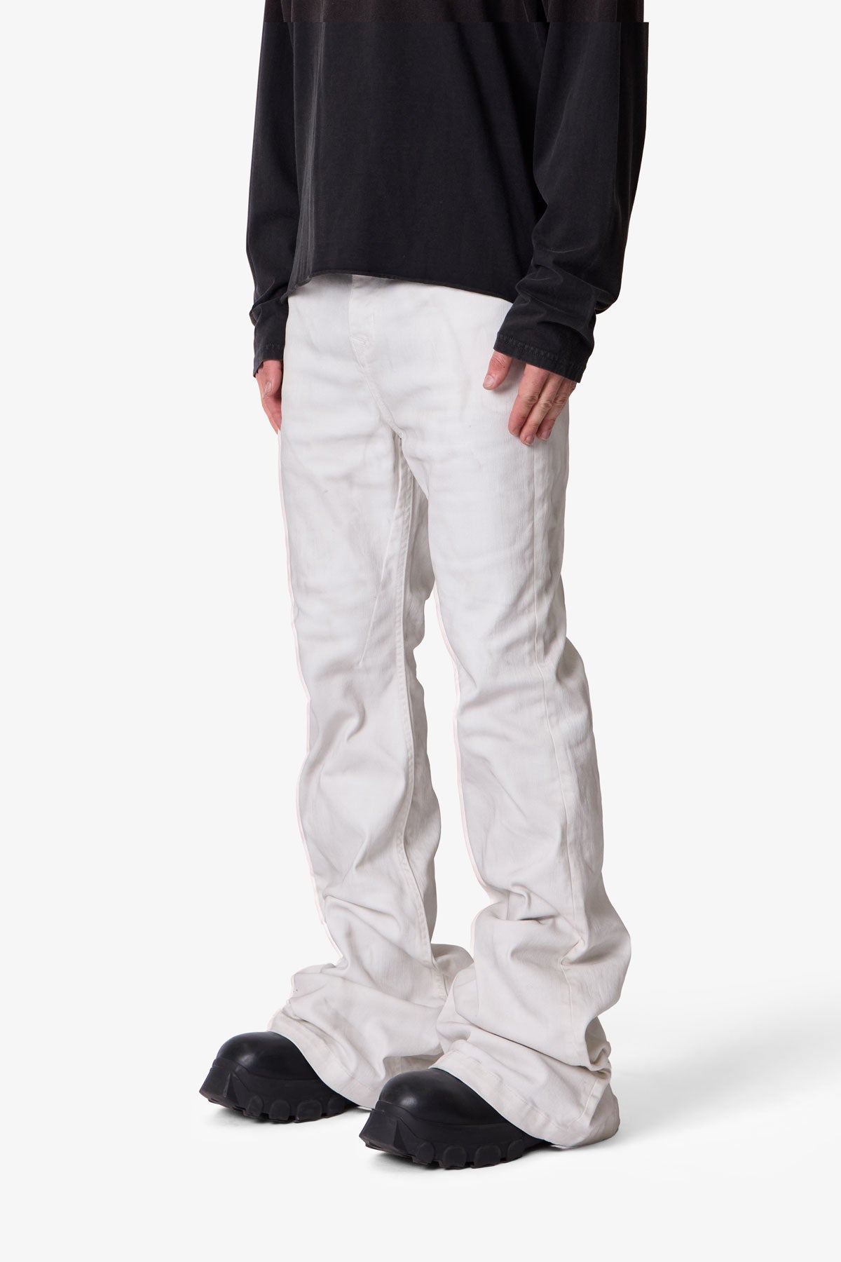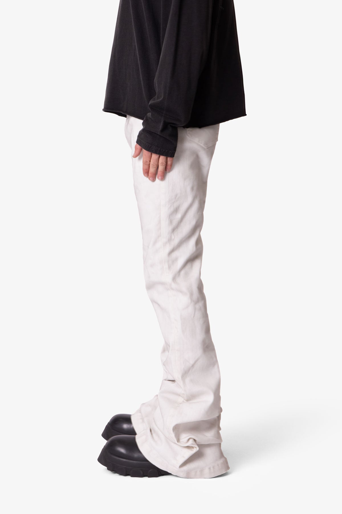 The Super Stacked Denim features a bootcut fit designed for a fitted thigh and a long rise. Constructed from 100% cotton, this denim includes a super long inseam and a wide leg opening for maximum stacking and flare effect. The light dirt wash provides a worn look, enhancing the overall aesthetic.