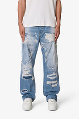 the Ultra Baggy Better Repaired Denim are designed with a new oversized ultra baggy fit, constructed from denim with a light vintage wash, with distressing and repair details throughout featuring standard five pocket denim details, and finished with a button placket.