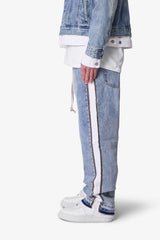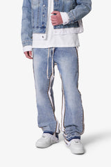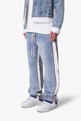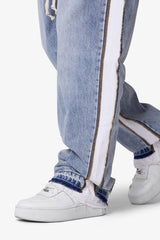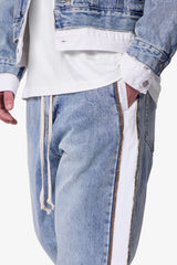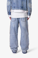 Constructed from 100% cotton 13 oz denim, the Ultra Baggy Border GN8 Denim features a light blue wash with offwhite contrast side paneling and exposed seaming. Designed with an elastic waistband and elongated drawcord, this pant offers a reconstructed look with a raw bottom hem and enhanced baggy leg. The Ultra Baggy Border GN8 Denim includes a longer-than-standard front rise and a wide fit throughout.