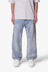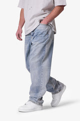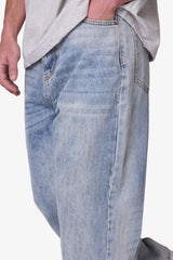 the Ultra Baggy Denim are designed with a new oversized ultra baggy fit, constructed from denim with a light wash, featuring standard five pocket denim details, and finished with a button placket.
