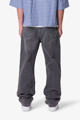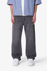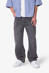 The Ultra Baggy Denim is constructed from 100% cotton denim with a grey stone wash finish. Designed with an ultra baggy fit, it features light sanding and subtle whiskering for a vintage aesthetic. Standard five-pocket construction, belt loops, and a button fly complete the silhouette.