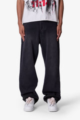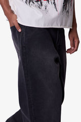Constructed from a cotton-poly blend with a vintage black wash, this baggy denim style features a relaxed fit through the hip and leg. Designed with standard five-pocket construction, belt loops, and a button closure at the waistband.