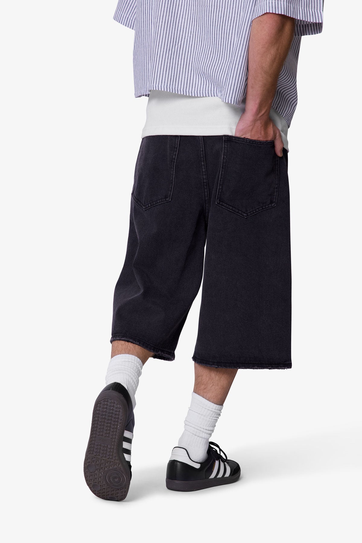 Constructed from a cotton-poly blend, these denim shorts feature a vintage black wash with subtle front whiskering and fading. Designed with a baggy, wide leg fit and a finished hem with light distressing. Includes a classic five-pocket layout, standard belt loops, and a front button fly.