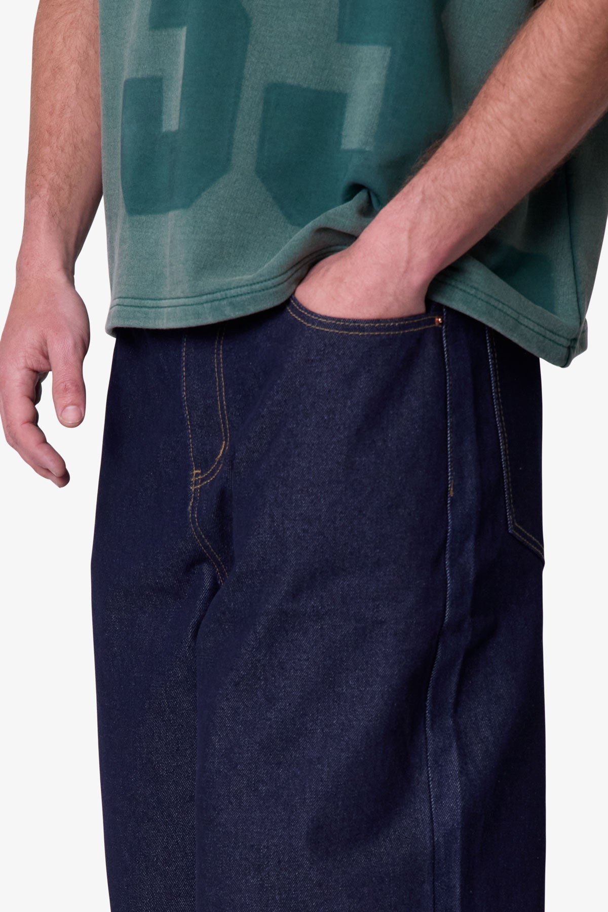 - Raw indigo denim with rinse wash