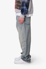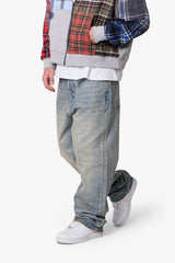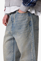 Constructed from 100% cotton denim with a light vintage wash, the Ultra Baggy Gem Denim features an exaggerated wide-leg silhouette with distressing and sanding details throughout. Designed with full gem appliqué along the legs, it includes standard five-pocket styling, belt loops, and a button fly closure.