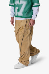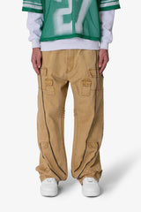 the Ultra Baggy Grid Lock Denim are designed with a new oversized ultra baggy fit, constructed from a tan denim with a vintage wash, featuring cargo pocket details throughout and finished with exposed zipper details down the legs.