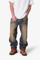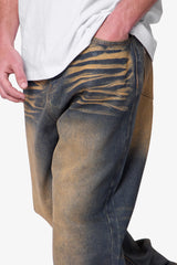 Constructed from 13 oz 100% cotton denim with a dark vintage blue wash, the Ultra Baggy High Low Denim features an ultra baggy fit with a longer-than-standard rise. Designed with high contrast whiskering and a yellow acid pp spray effect, this style delivers a pronounced tonal variation throughout. Finished with a classic five-pocket layout.