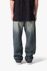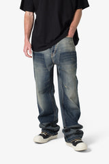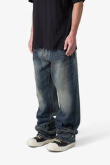 the Ultra Baggy Shadow Patch Denim are designed with a new oversized ultra baggy fit, constructed from denim with a dark wash, featuring standard five pocket denim details, witness wash from work panelling, and finished with a button placket.