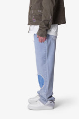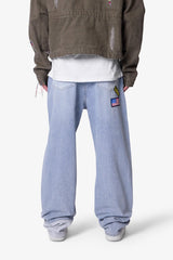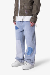 Constructed from 100% cotton with a light blue vintage wash, this denim features a wide-leg silhouette with a heavily relaxed fit. Designed with striped denim fabric and contrast blowout repair patches, it includes a lighter wash panel on the right leg, multicolor embroidery at the front pocket openings, and two rear patch details.