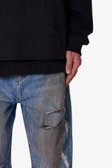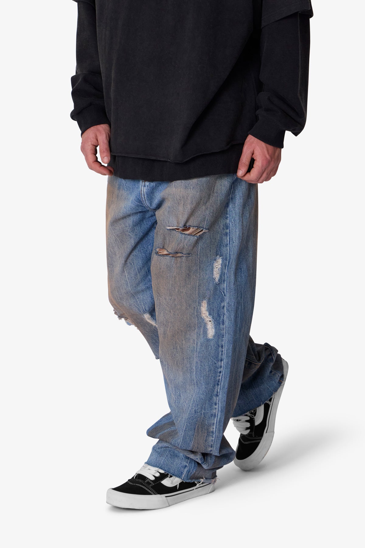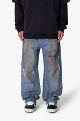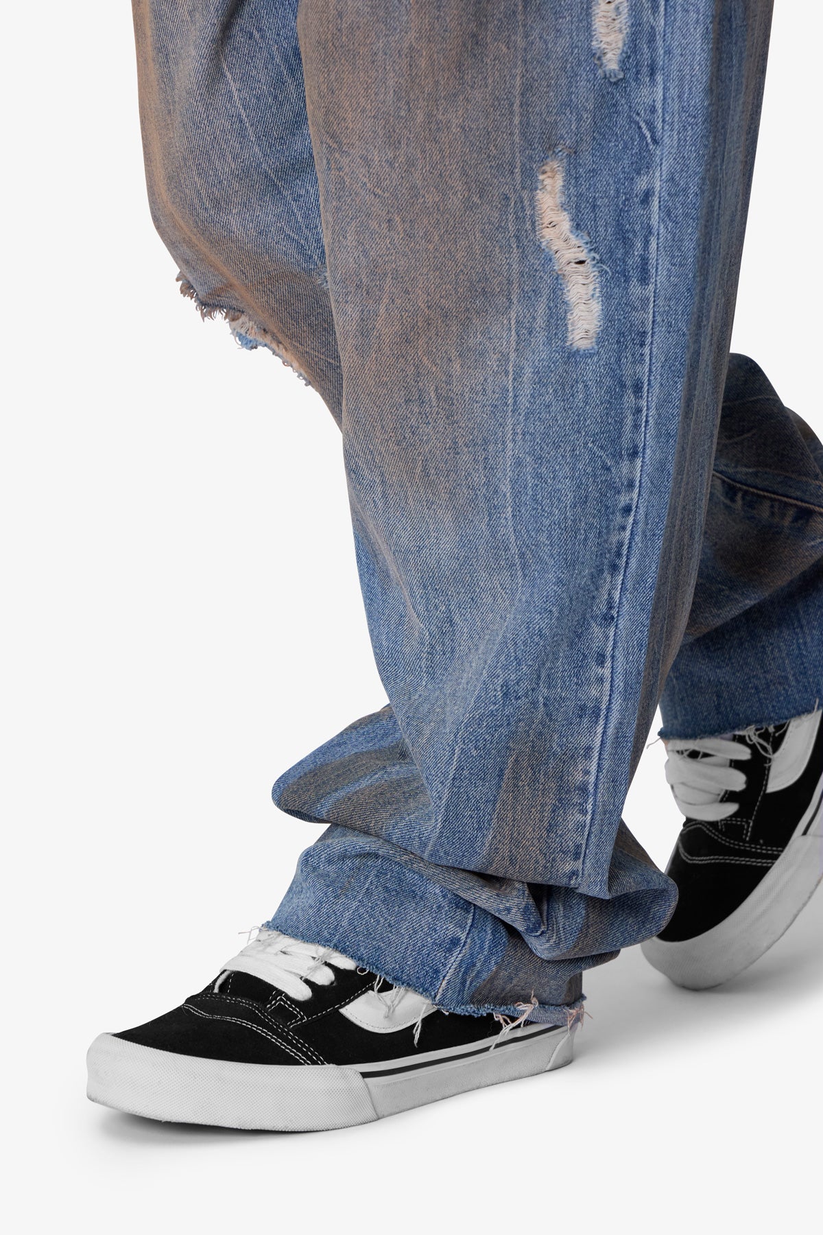 the Ultra Baggy Ran Over Denim are designed with a new oversized ultra baggy fit, constructed from denim with a vintage wash, with a dirt tint and distressing details throughout featuring standard five pocket denim details, distressing throughout and finished with a button placket.