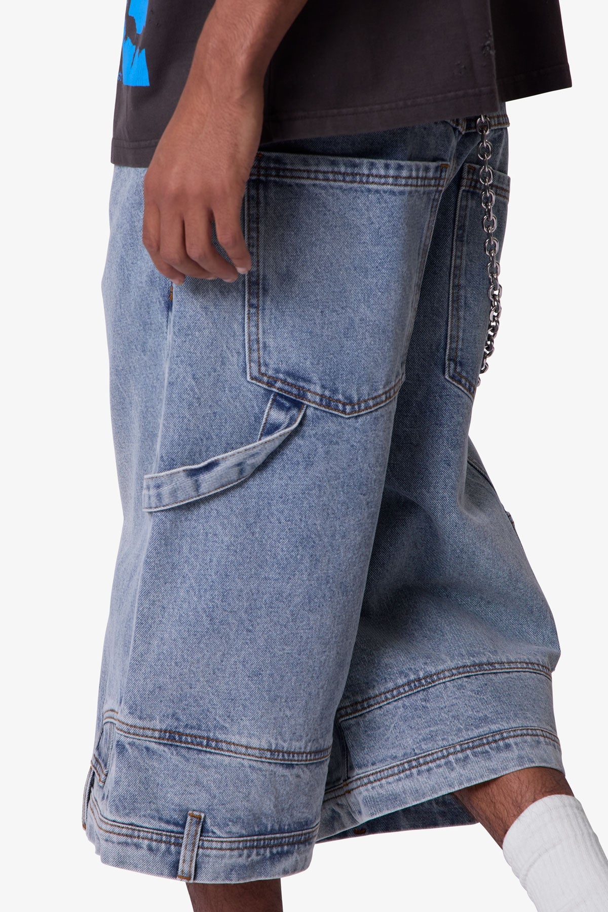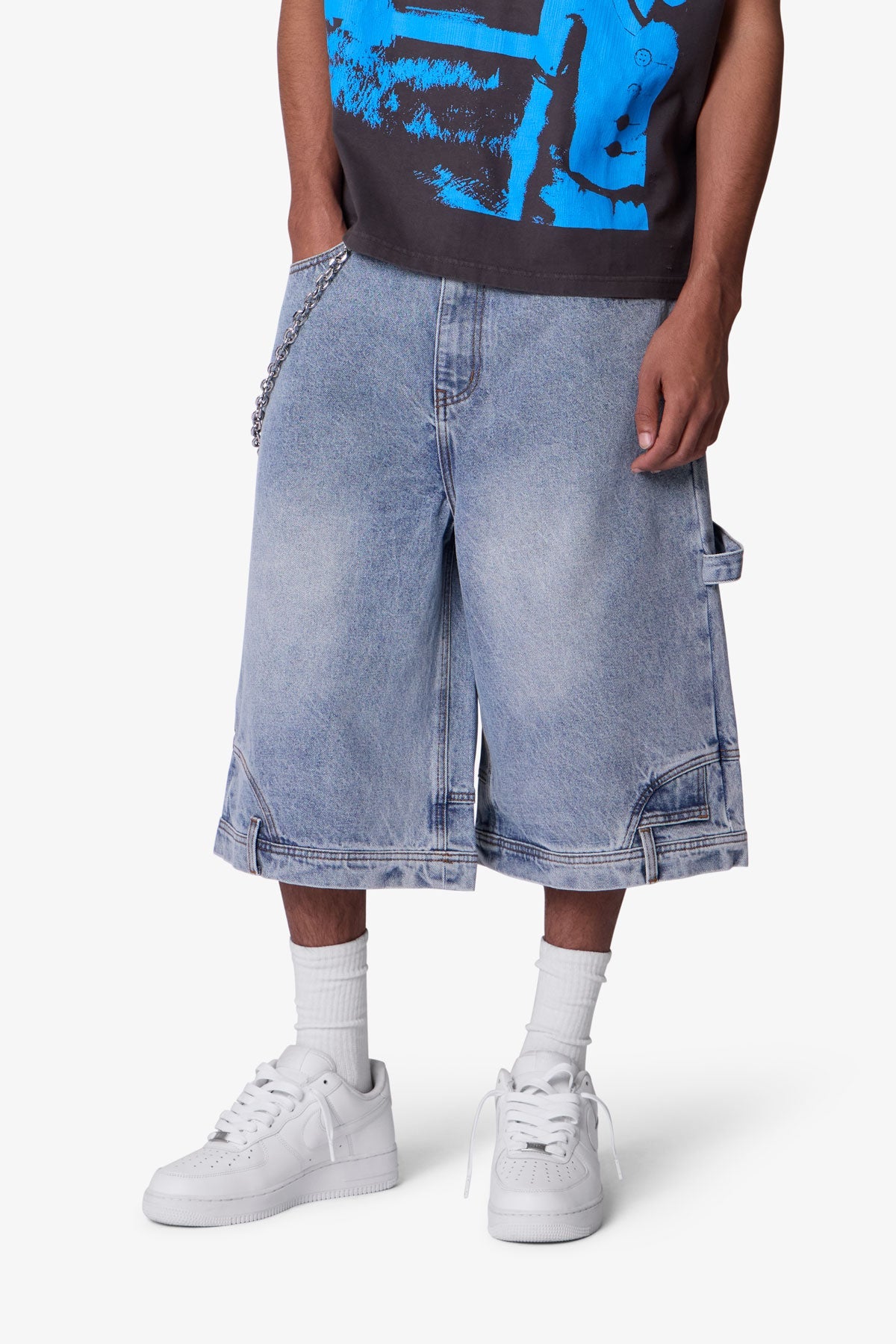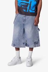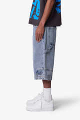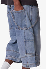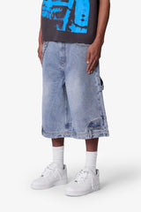 Constructed from 100% cotton denim, these oversized shorts feature a relaxed, baggy silhouette that extends past the knee. Designed with a light vintage blue wash, they include subtle fading and whiskering throughout. Deconstructed detailing includes belt loops and a side pocket at the bottom hem, finished with classic 5-pocket styling and utility-inspired side hammer loop and work pocket.