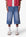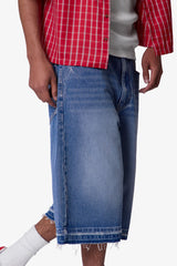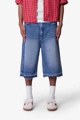 Constructed from a cotton-poly blend with a medium blue wash, these longline denim shorts feature a baggy Y2K-inspired silhouette with an extended inseam. Finished with subtle whiskering and faded detailing at the thighs for a worn-in look. The raw-cut released hem adds fraying detail at the edge.