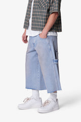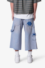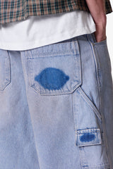 The Ultra Baggy Tool Denim Shorts are constructed from 100% cotton in a medium blue wash. Designed with a wide-cut silhouette, these shorts feature light PP spray at the front waist and thighs for a vintage effect, ghost patch details, and carpenter-style pockets and loop at the side seam. Finished with raw, unfinished hems and a classic waistband with belt loops.