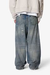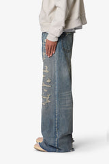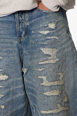 The Ultra Repaired Rave Denim features a baggy silhouette constructed from 100% cotton denim with a stone wash and pp spray finish. Designed with a dark stone-washed base and layered antique wash, the jeans showcase multiple rips, raw edge holes, and repaired denim patches with boro stitching. Additional details include whiskering, sanding, raw hems, and distressing at the back ankle. Finished with a standard waistband, five-pocket layout, and button fly.