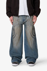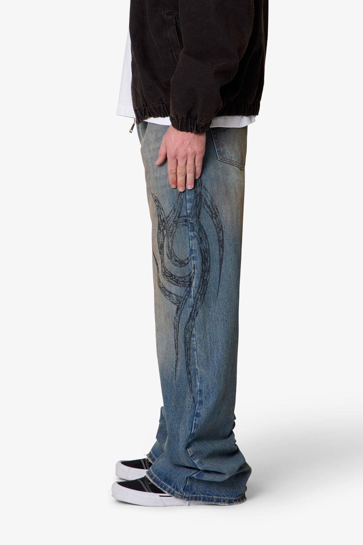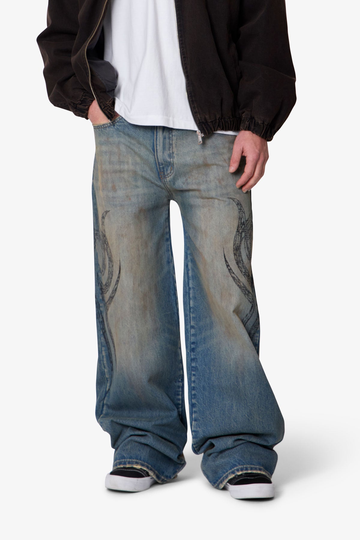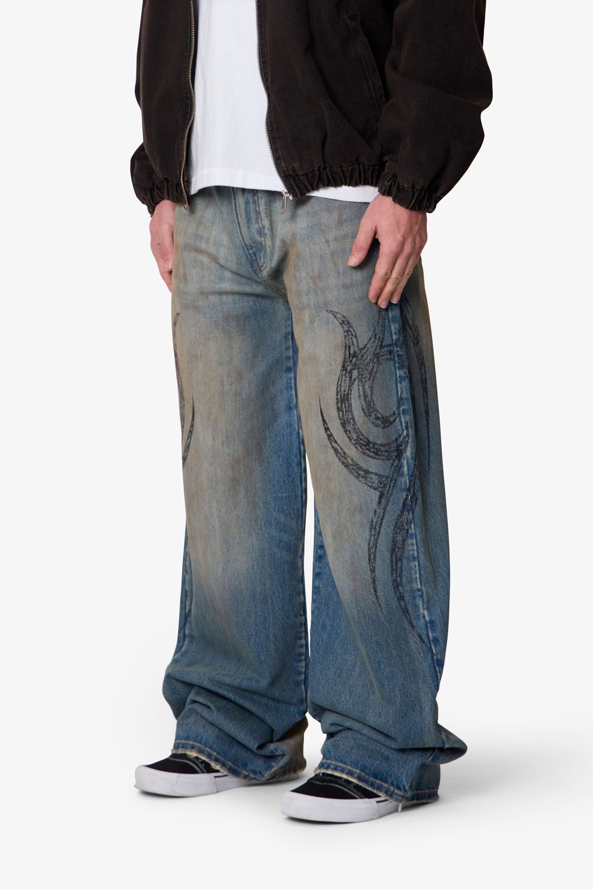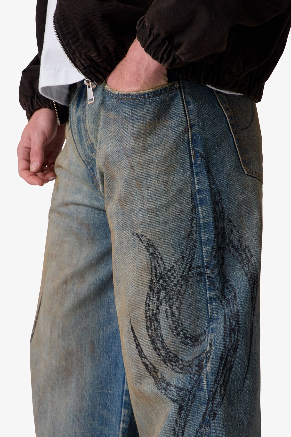 The Ultra Wide Tribal Denim features a mega baggy oversized fit with wide legs, providing a comfortable and contemporary silhouette. Crafted from 100% cotton denim, it includes an adjustable internal drawcord for tailored wear. The medium blue vintage wash is complemented by a tinted effect for a worn-in look, while the printed Y2K-esque tribal motif accents the side legs.