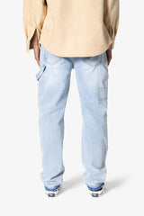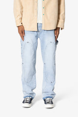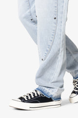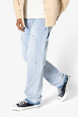 the V694 Oval Double Knee Denim is designed with our updated V fit which is more relaxed throughout than our initial V fit, featuring a light blue denim wash, released hem, and finished with a bordered oval knee detail.