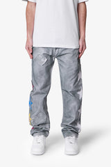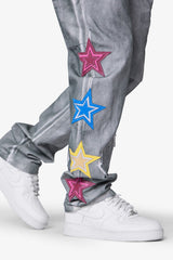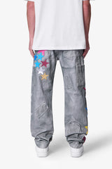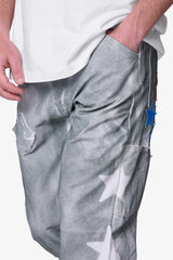 Constructed from heavyweight 100% cotton denim, this pant features a garment wash and pp spray treatment for a faded, cloudy texture. Designed with star patch detailing throughout, including a vertical column of five stars on the right leg, ghost patches on the left leg, and additional patchwork at the back. Distressed repair patches enhance the worn-in appearance. Finished with standard five-pocket construction and belt loops.