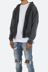 the Basic Zip Up Hoodie is designed from 100% cotton fleece, with a T8 metal zipper at the chest, a kangaroo pocket that is split onto both sides, and is finished with a vintage wash.