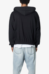 the Basic Zip Up Hoodie is designed from 100% cotton fleece, with a T8 metal zipper at the chest, a kangaroo pocket that is split onto both sides, and is finished with a garment wash.
