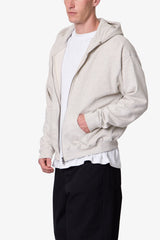 the Basic Zip Up Hoodie is designed from 100% cotton fleece, with a T8 metal zipper at the chest, a kangaroo pocket that is split onto both sides, and is finished with a garment wash.