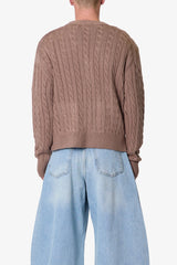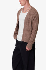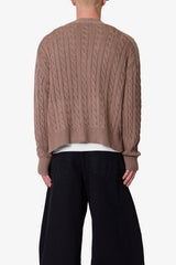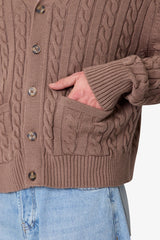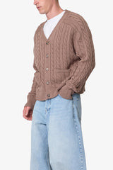 Constructed from 100% acrylic, the Cable Knit Cardigan Sweater features a relaxed, slightly cropped silhouette. Designed with a classic cable knit pattern, the sweater includes a V neckline, ribbed trim at the neckline and placket, and two front patch pockets. Finished with large tortoise shell buttons at the front closure, and ribbing at the cuffs and hem.