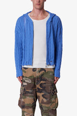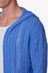 Constructed from soft, medium-weight yarn in a vivid periwinkle blue, this piece features a traditional cable knit pattern throughout the body and sleeves. Designed with a cropped fit, raw bottom opening, and integrated hood. Finished with light distressing, a ladder knit detail, and a front zipper closure.