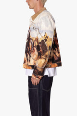 the Cowboy Print Trucker Jacket is designed with a relaxed fit, button down closure, suede collar, and constructed in 100% cotton fabric. Ride into style, featuring a vibrant cowboy print perfect for adding a touch of rugged charm to any outfit.