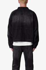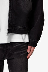 the Denim Chore Coat is made from a 13 oz 100% cotton denim, a vintage wash, pockets at the side seam, flat and finished hem, and finished with a zipper placket.