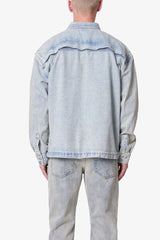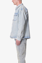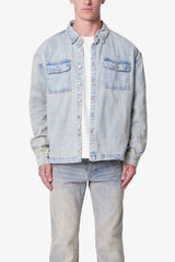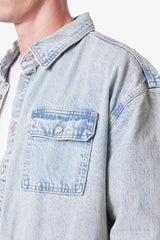 the Denim Shirt Jacket is made from a 13 oz 100% cotton denim, a light vintage wash, pockets at the chest, flat and finished hem, and finished with brushed buttons at the placket.