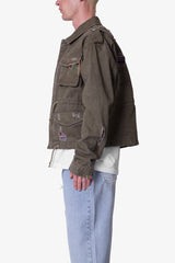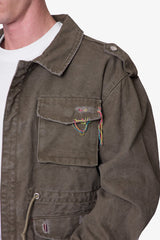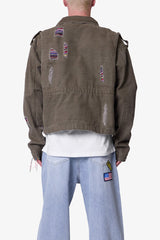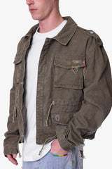 Constructed from 100% cotton canvas with a heavy vintage wash, this standard fit jacket is slightly cropped at the waist. Features include four front cargo pockets, epaulets, a snap and zipper front closure, and a drawcord at the waist. Finished with subtle distressing and patch repairs using fabric inspired by tribal wovens.