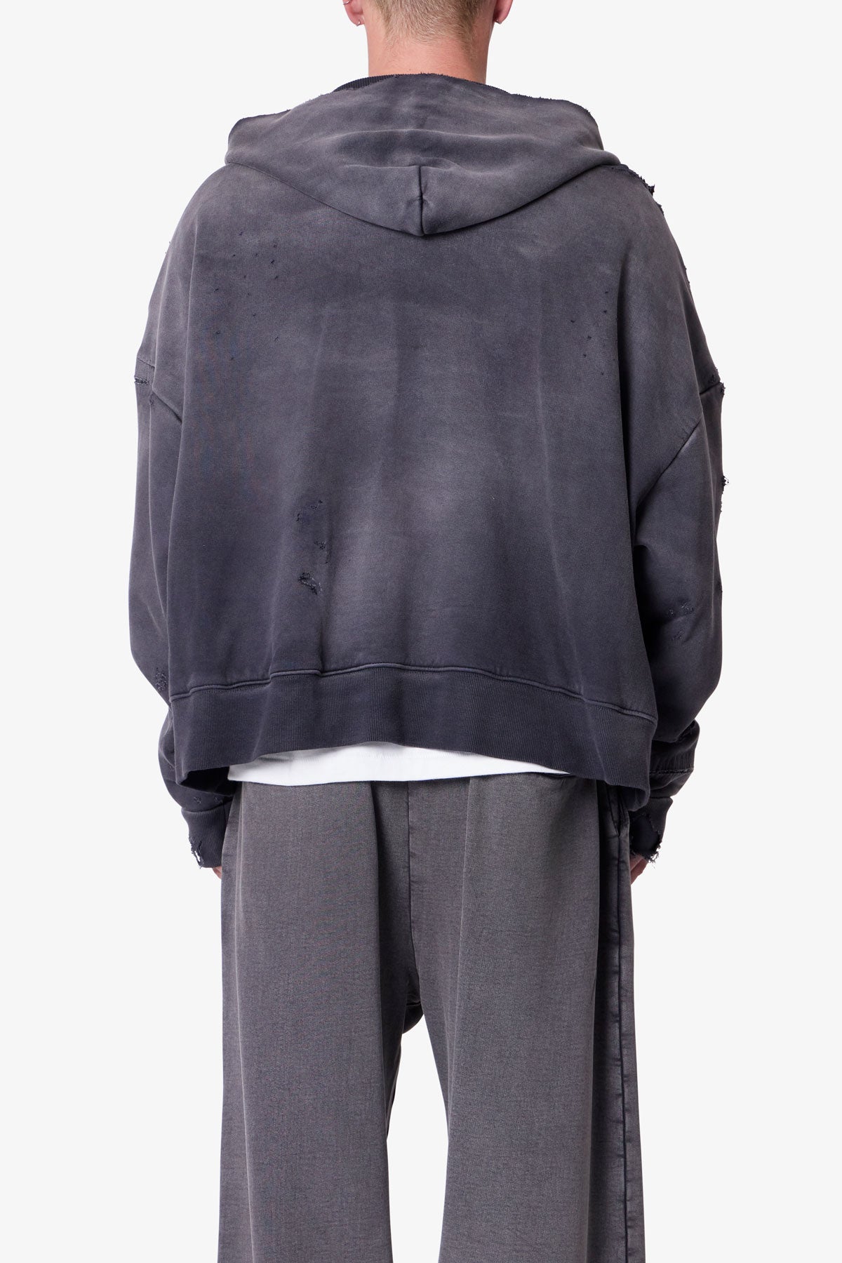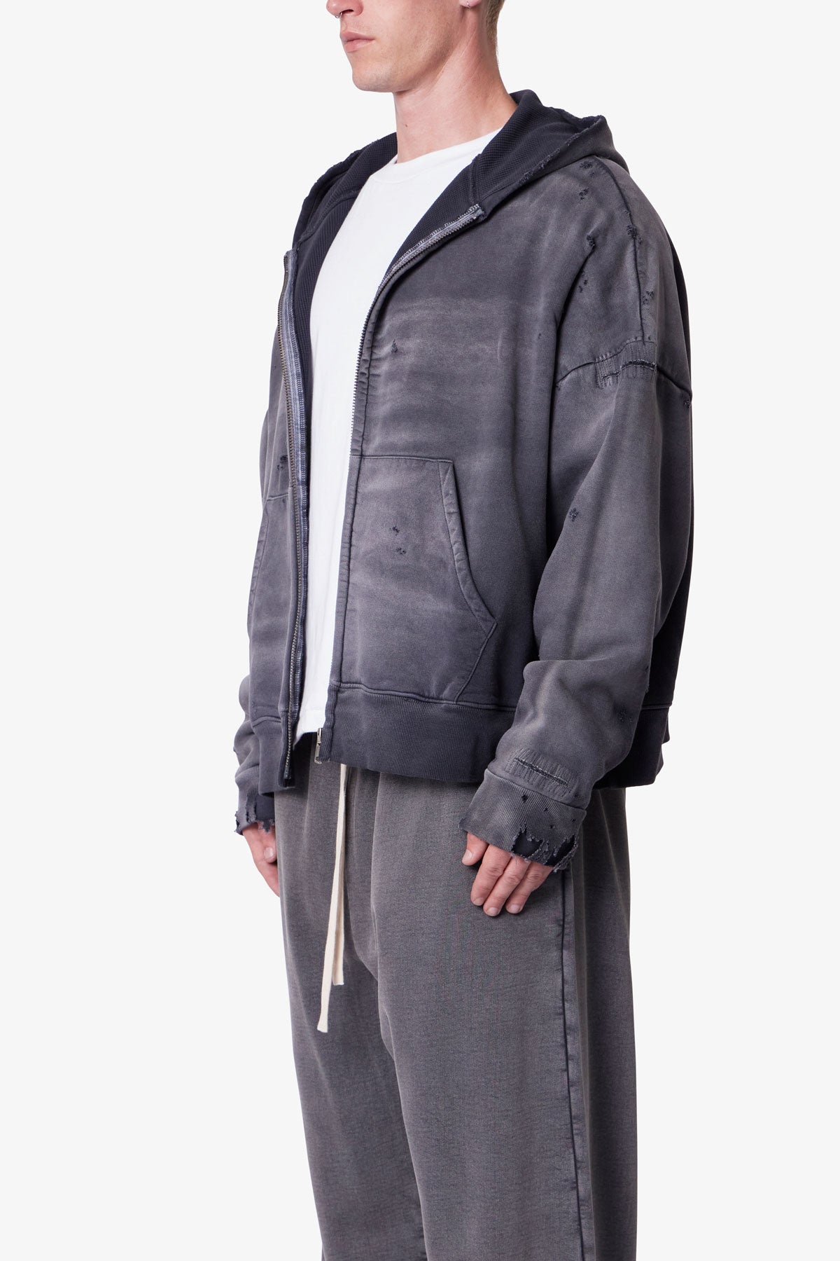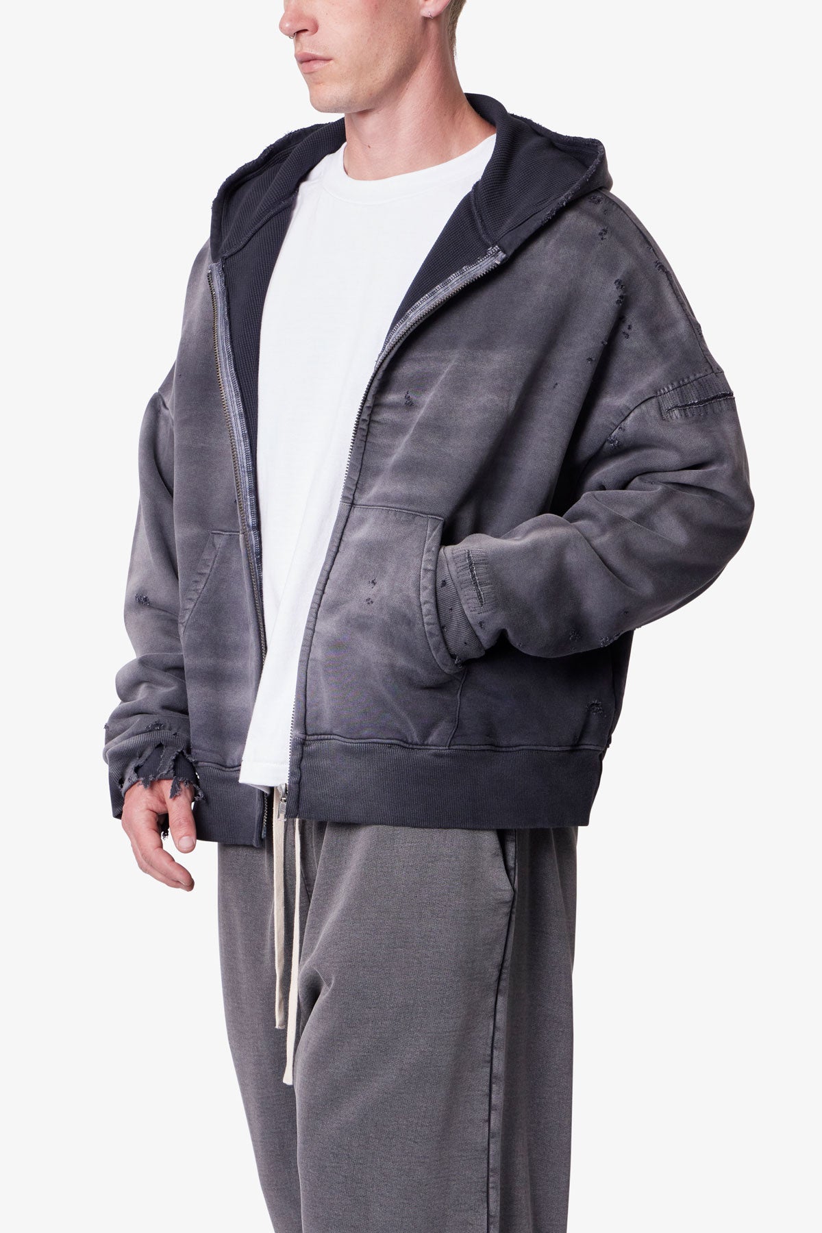 Constructed from 100% cotton fleece with a vintage wash, the Distressed Thermal Lined Hoodie features a wide, cropped fit and a relaxed silhouette. Designed with a T8 metal zipper, it's finished with kangaroo front pockets, distressing details throughout, lined in a thermal fabric throughout, ribbed sleeve cuffs, and a ribbed bottom opening.