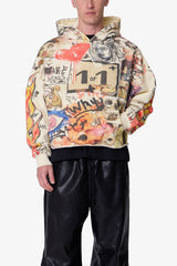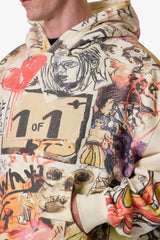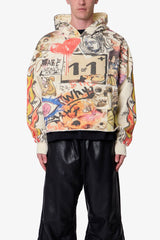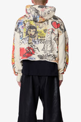 Constructed from 100% cotton fleece with a weight of 380 gsm, the Doodle Hoodie is a cropped pullover designed for a relaxed fit. Featuring a dropped shoulder and a relaxed silhouette, the hoodie showcases a unique art print comprised of various doodles done in multiple art styles. The vintage wash provides an extra worn effect, while the raw hem adds to the overall aesthetic.