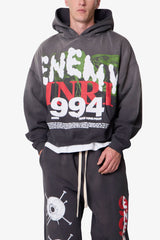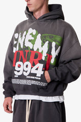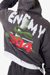 The Enemy Hoodie is a cropped pullover designed for a wide and relaxed fit. Constructed from 100% cotton fleece, it features a dropped shoulder silhouette and a kangaroo pocket. The garment is enzyme washed and finished with a PP spray for a worn-out effect. Large screen-printed art, displaying the text enemy 994 along with a snake graphic, is featured prominently on both the front and back.
