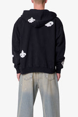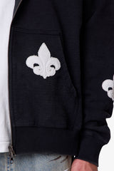 Made from 450 gsm cotton french terry with an acid wash, the Fleur Zip Up Hoodie features a relaxed silhouette with raw-edged, lightly distressed fleur de lis patch appliqués placed throughout. Designed with a front zip closure, it includes a kangaroo pocket, ribbed cuffs, and a ribbed hem.