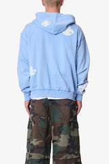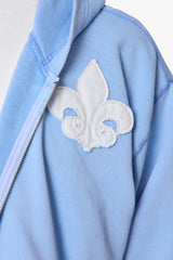 Made from 450 gsm cotton french terry with an acid wash, the Fleur Zip Up Hoodie features a relaxed silhouette with raw-edged, lightly distressed fleur de lis patch appliqués placed throughout. Designed with a front zip closure, it includes a kangaroo pocket, ribbed cuffs, and a ribbed hem.