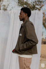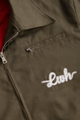 the Genesis Work Jacket is designed in a cotton twill fabric and features pockets at the waist, zipper closure at the chest, LWH embroidery on the chest, and is finished with contrasting red knit lining.